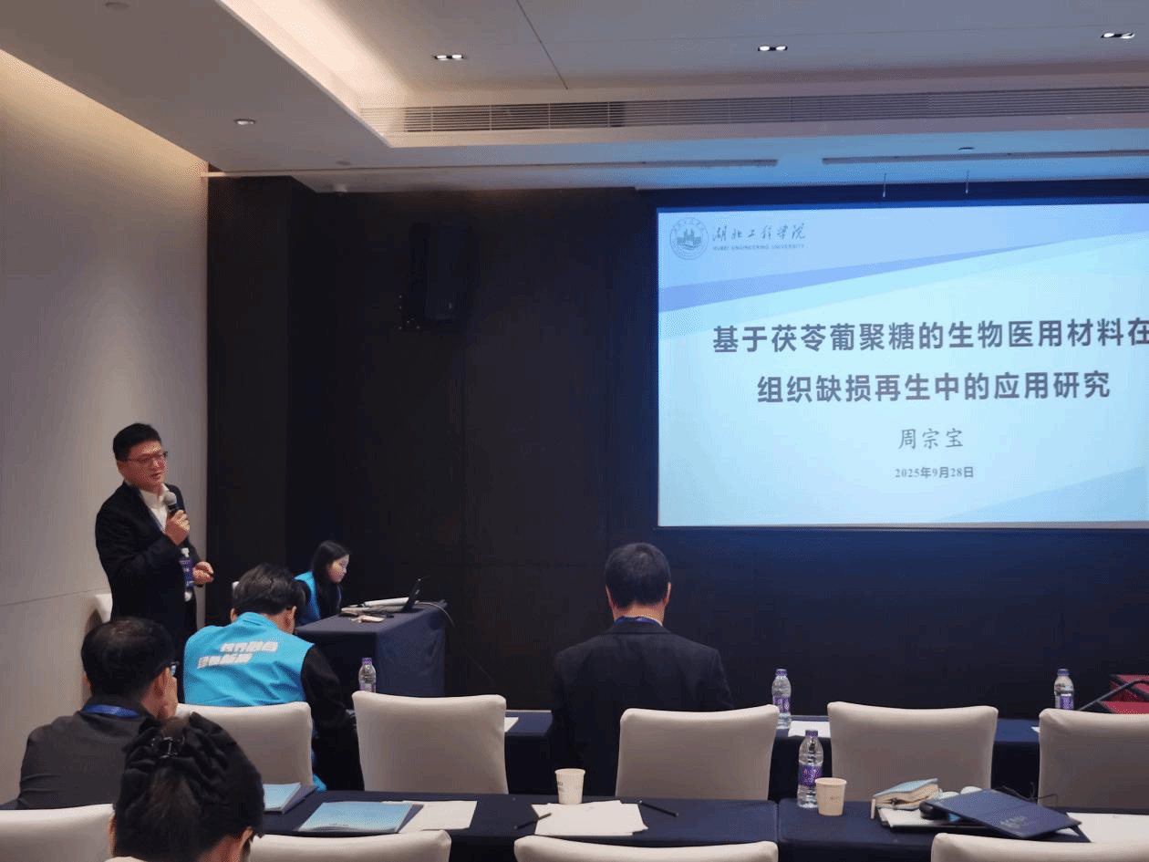 本次研讨会汇聚了两院院士、高校科研团队领军学者、头部企业技术总监、医疗机构专家及风险投资机构代表,围绕生物材料设计、智能制造工艺、生物医药载体开发、绿色可降解材料、植物生物技术体系开发与合成生物学等前沿方向,旨在搭建学术界、产业界与资本界的高效对话平台。在分论坛环节,周宗宝博士作了题为“基于茯苓葡聚糖的生物医用材料在组织缺损再生中的应用研究”学术报告,并就茯苓在生物医学领域的研究与参会专家展开深入交流探讨。